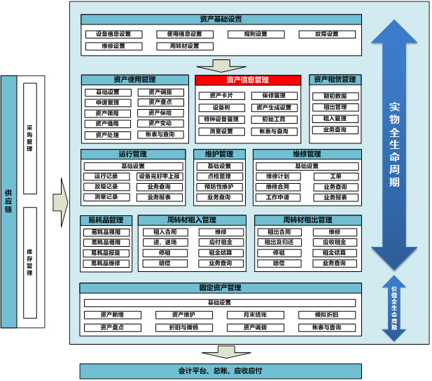 資產(chǎn)信息管理是資產(chǎn)管理解決方案的基礎(chǔ),對資產(chǎn)核算實物進行全面跟蹤與管控,其中最主要的是為企業(yè)設(shè)備卡片提供集團管理,準確、及時、全面跟蹤資產(chǎn)在整個生命周期使用過程中的狀態(tài)變化。資產(chǎn)信息管理是為提高設(shè)備資產(chǎn)的利用率,降低資產(chǎn)維護運營的成本,以及實現(xiàn)盤清企業(yè)家底, 實現(xiàn)“三賬相符”的堅實基礎(chǔ)。
