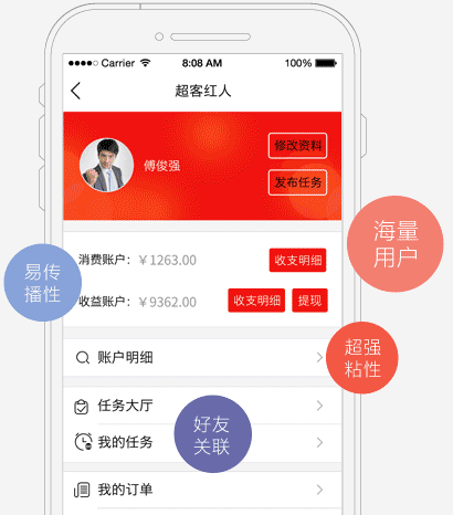 顛覆性的信息傳播方式,通過超客紅人海量的大V資源,以極低的成本使您的產品信息、促銷活動得到病毒式的快速擴散,并且可以通過自身行業選取微信紅人,從而實現精準推廣,優勢傳播,提升品牌知名度。